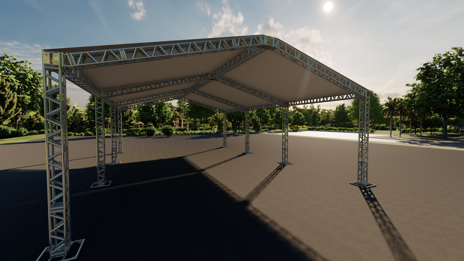 Montagem fácil e rápida: Coberturas em Box Truss modulares em Alumínio com Lona superior.